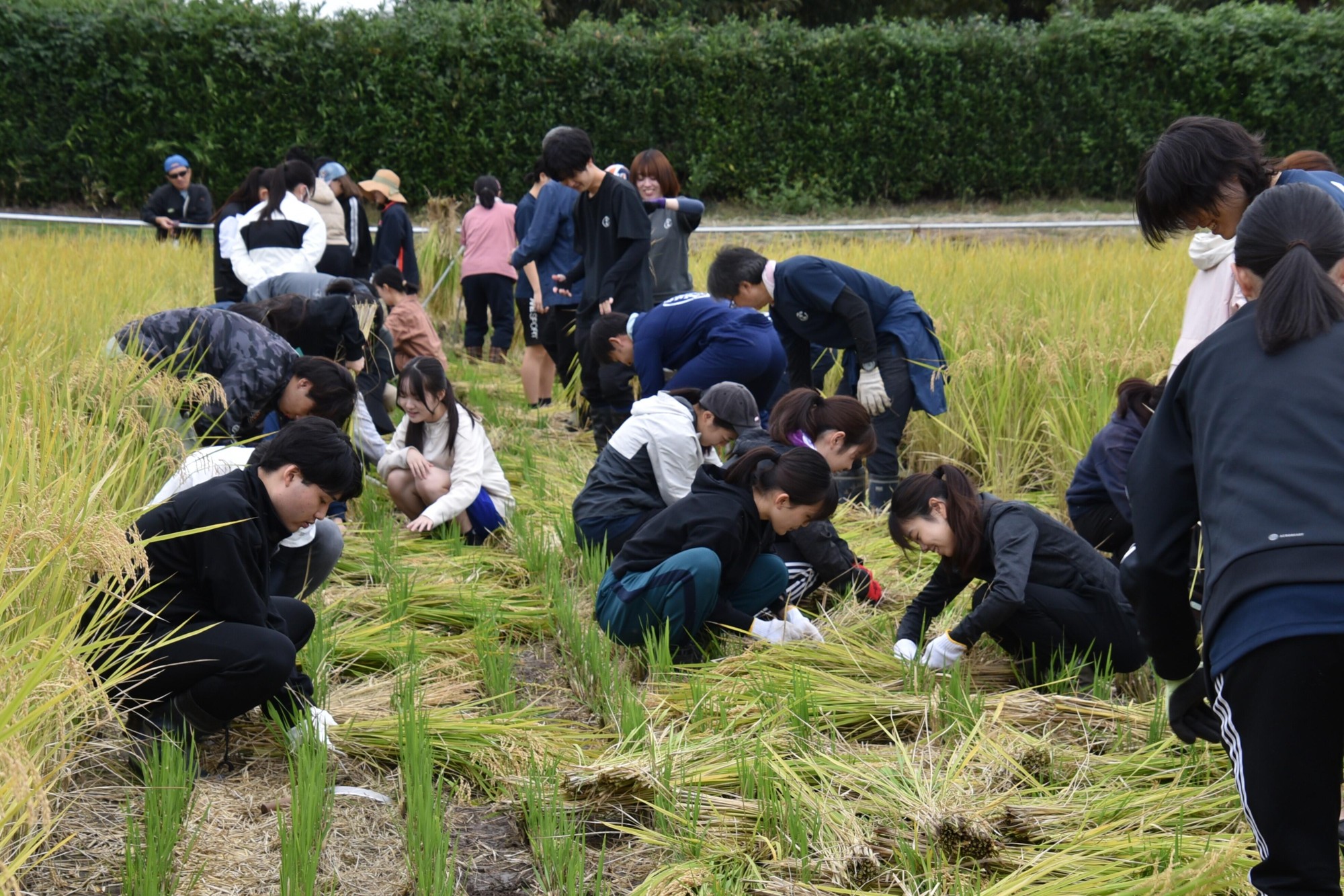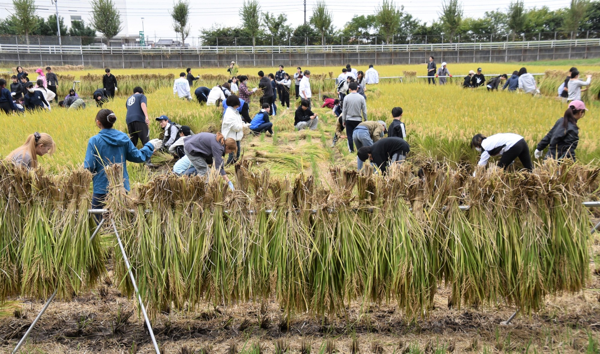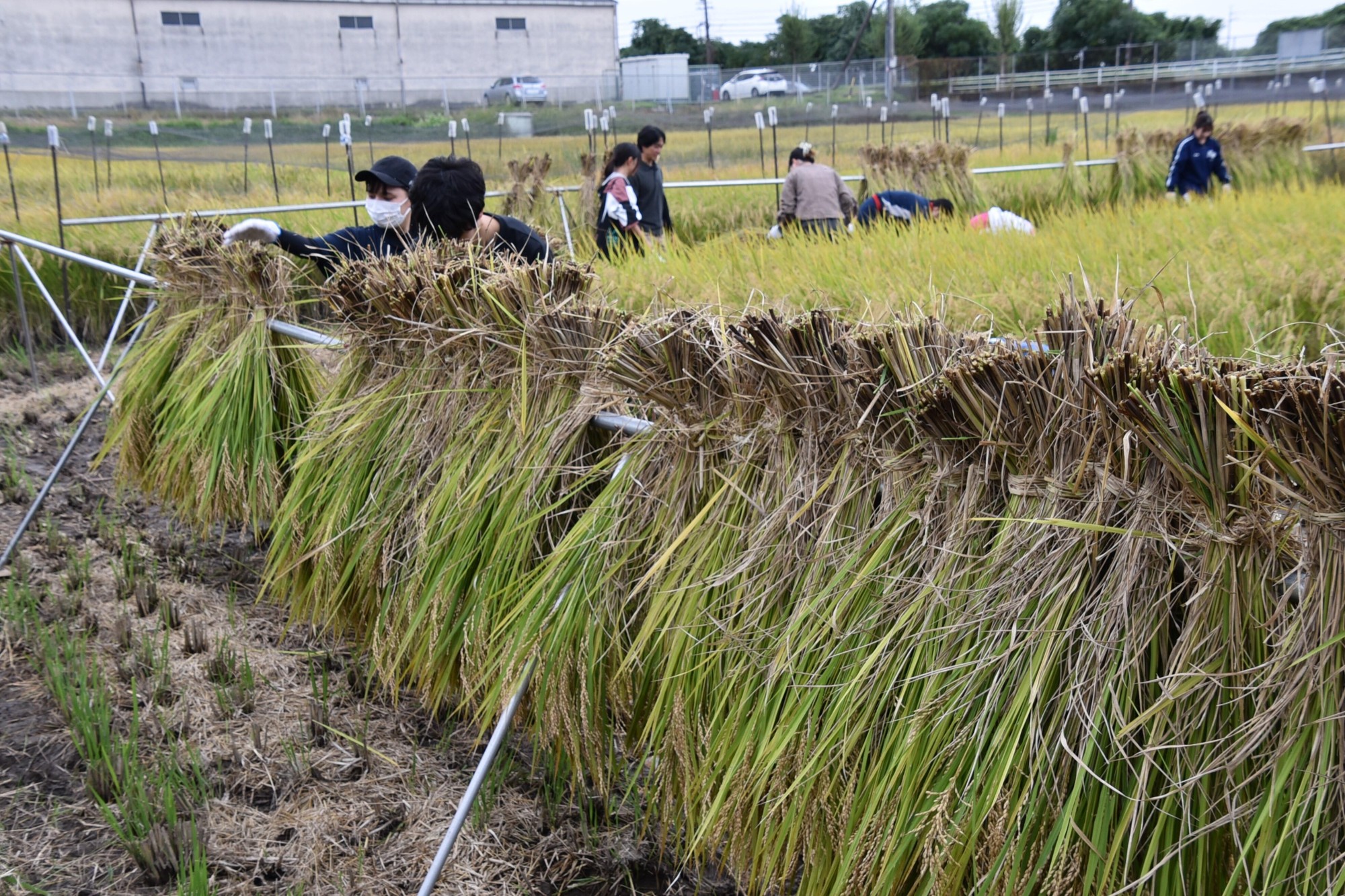 春日井(鷹来)キャンパス農学部附属農場で10月25日、農学部の教職員と大学院生、学生、附属高校生ら約200人が参加して、恒例の収穫祭が開催されました。参加者は今年6月に田植えをして丹精して育て、酷暑を乗り切って黄金色に実った「あいちのかおり」の稲刈り作業に精を出しました。