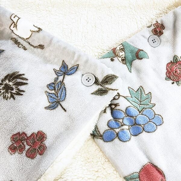まずご紹介するアイテムは、ムーミンのフルーツガーデン柄、ボア付3WAYケープブランケットです。