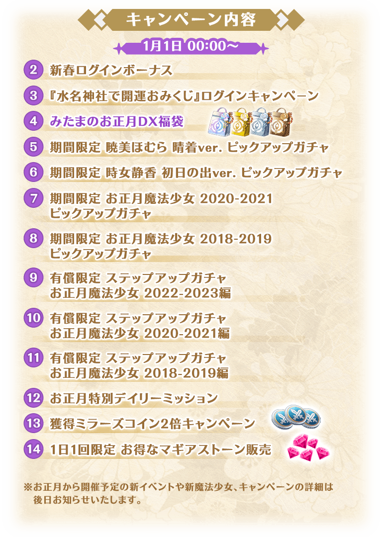 蒼樹うめ描き下ろしのキャラクターが多数登場するスマートフォンゲーム『マギアレコード 魔法少女まどか☆マギカ外伝』(iOS/Android/Windows向けアプリ 基本プレイ無料 ※一部アイテム課金あり)は、12月31日16:00より、『お正月キャンペーン』の開催を予定しております。