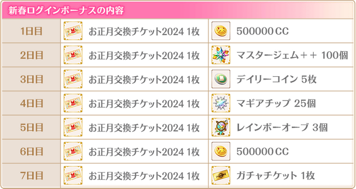 該当の期間限定デイリーミッションを達成することで、「お正月交換チケット2024」を最大12枚獲得できます。