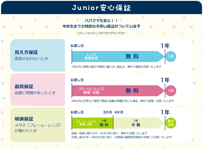 パリミキではお客様に長く・快適にご利用いただくためのアフターサービスとして、メガネを壊しやすい中学生までの子どもに向けた安心保証を設けています。