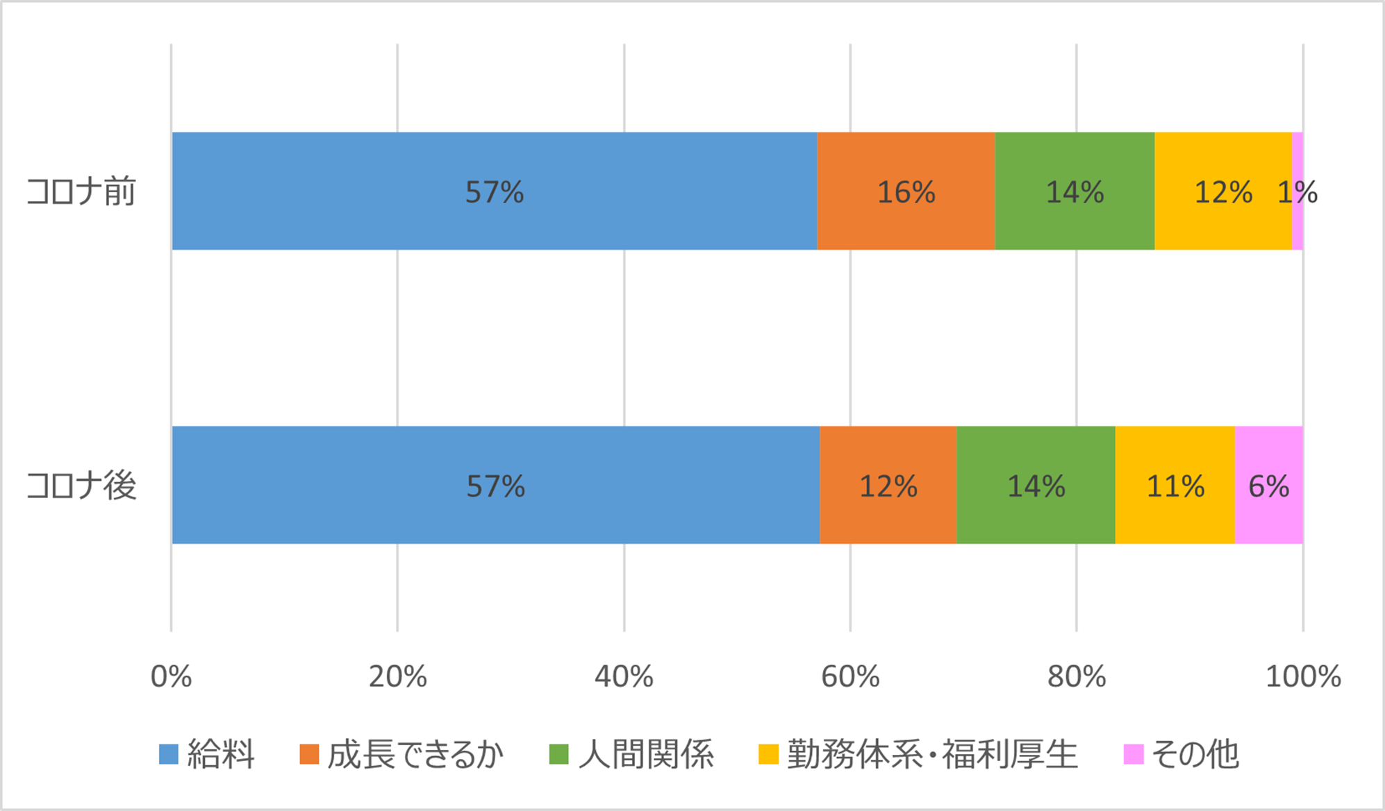 2位以下も「成長できるか」「人間関係」「勤務体系・福利厚生」と同じ順位で続き、コロナ禍とはいえ仕事選びの基準には変化がないことが分かります。