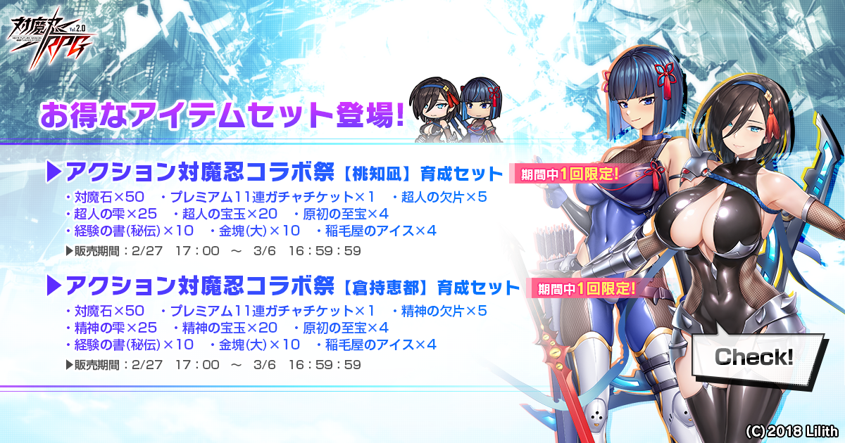 株式会社インフィニブレイン(本社:大阪市中央区、代表取締役:武山 英治)は、オンラインゲームプラットフォーム「DMM GAMES」( https://games.dmm.com/ )にて配信している、近未来くノ一ロールプレイングゲーム『対魔忍RPG』は、2月27日(金)よりアクション対魔忍コラボ祭ガチャなどのお知らせをいたします。