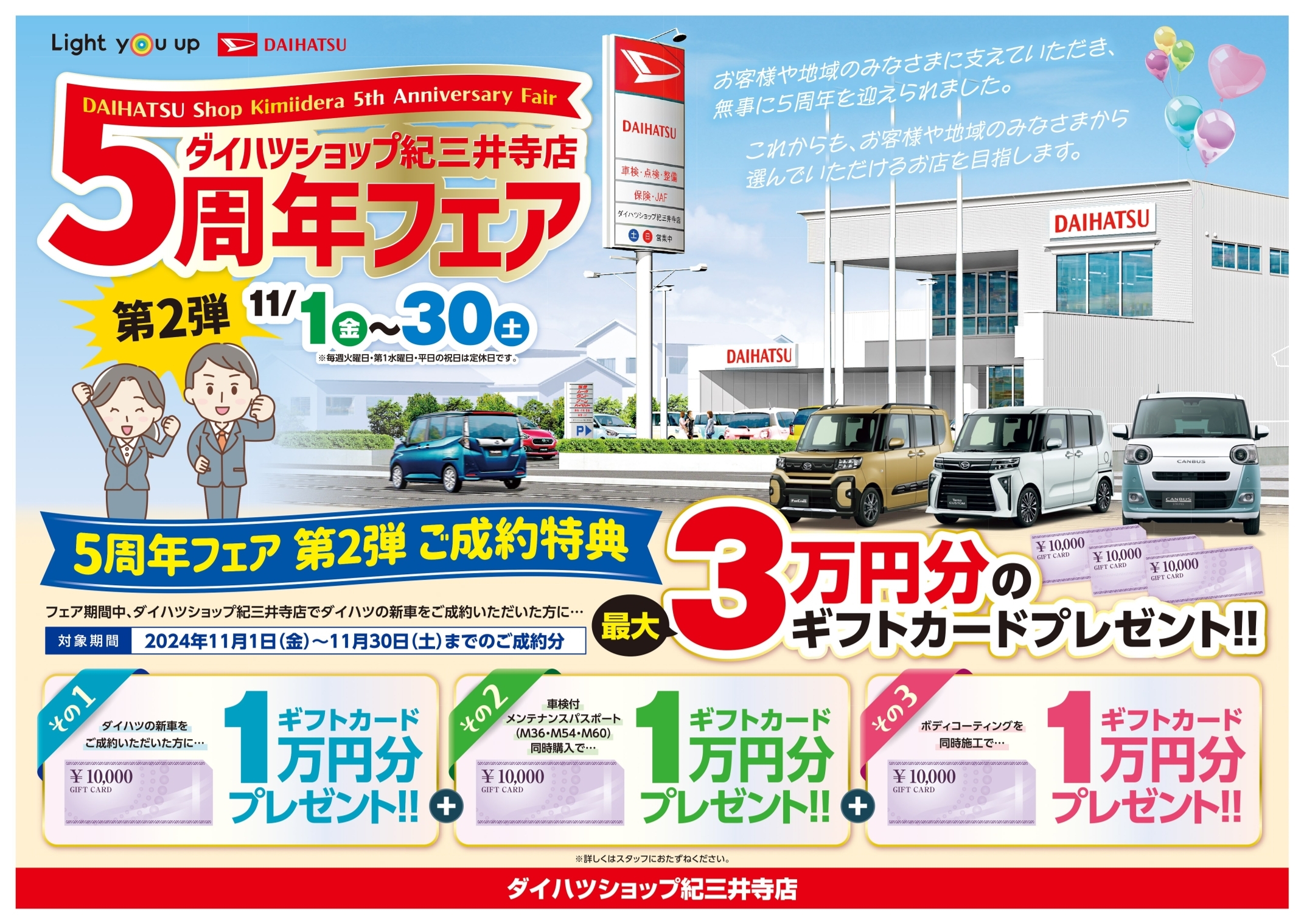 ダイハツショップ紀三井寺店では、お客様に支えていただき無事にオープン5周年を迎えることができたことを記念して、「ご成約で最大3万円分のギフトカードプレゼント」などの特典を用意したフェアを開催します。