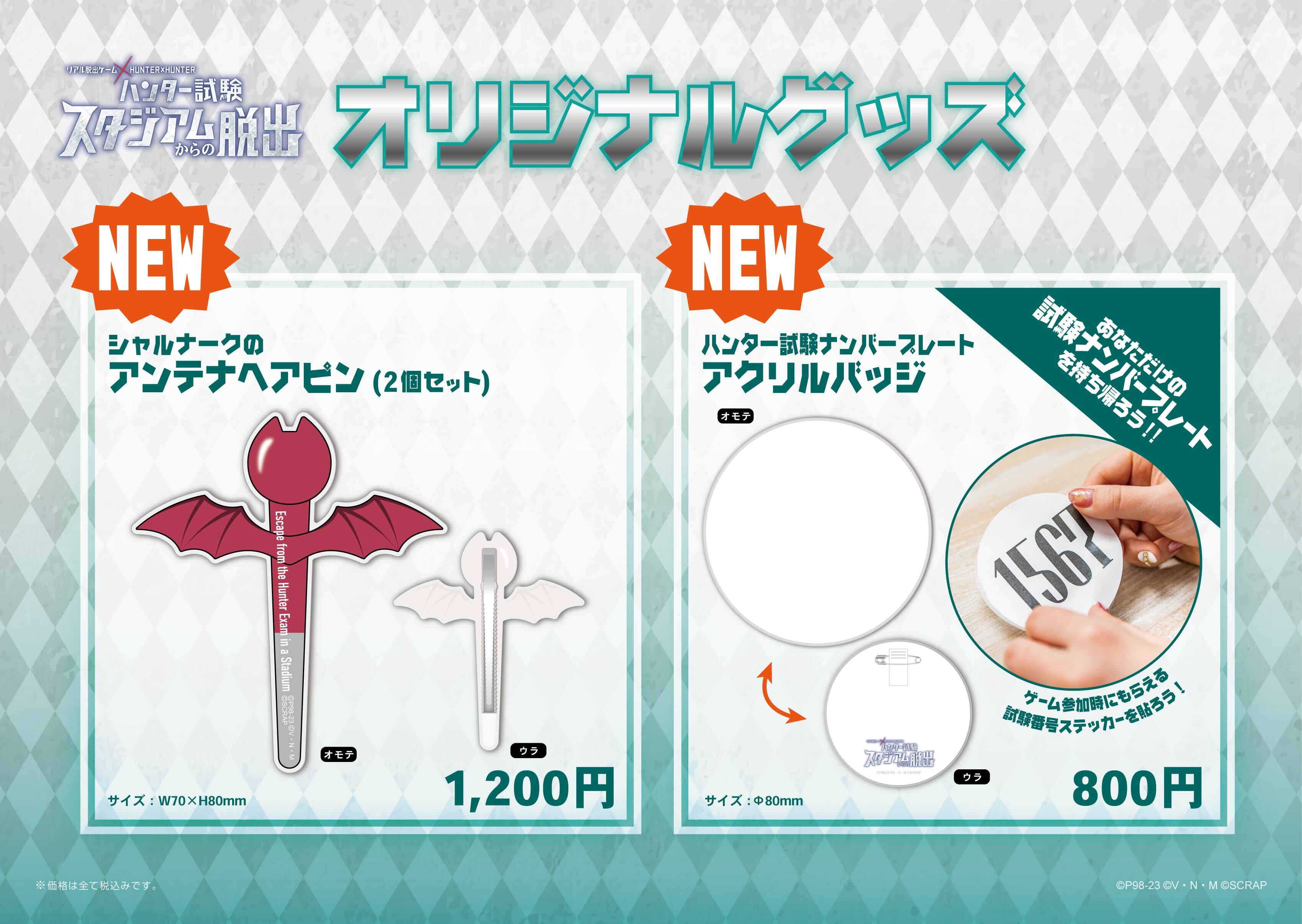 また、会場では全12種のオリジナルグッズを販売。リアル脱出ゲーム本編にも登場するキャラクター「シャルナーク」の念能力「携帯する他人の運命(ブラックボイス)」をモチーフにした「シャルナークのアンテナヘアピン」や、アニメでもお馴染みのハンター試験のナンバープレートを再現した「ハンター試験ナンバープレートアクリルバッジ」など、ユニークな商品を多数ラインナップ。