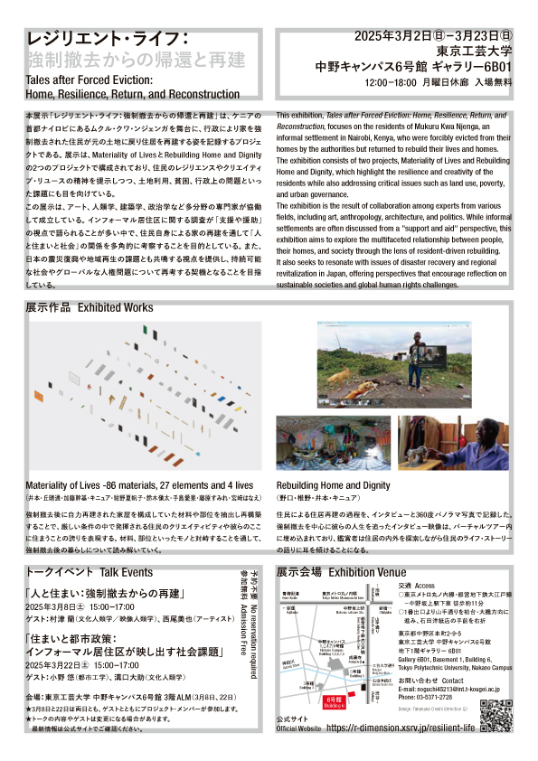 東京工芸大学芸術学部(学長:吉野 弘章、所在地:東京都中野区 以下、本学)は、「レジリエント・ライフ:強制撤去からの帰還と再建」展(以下、本展)を開催します。