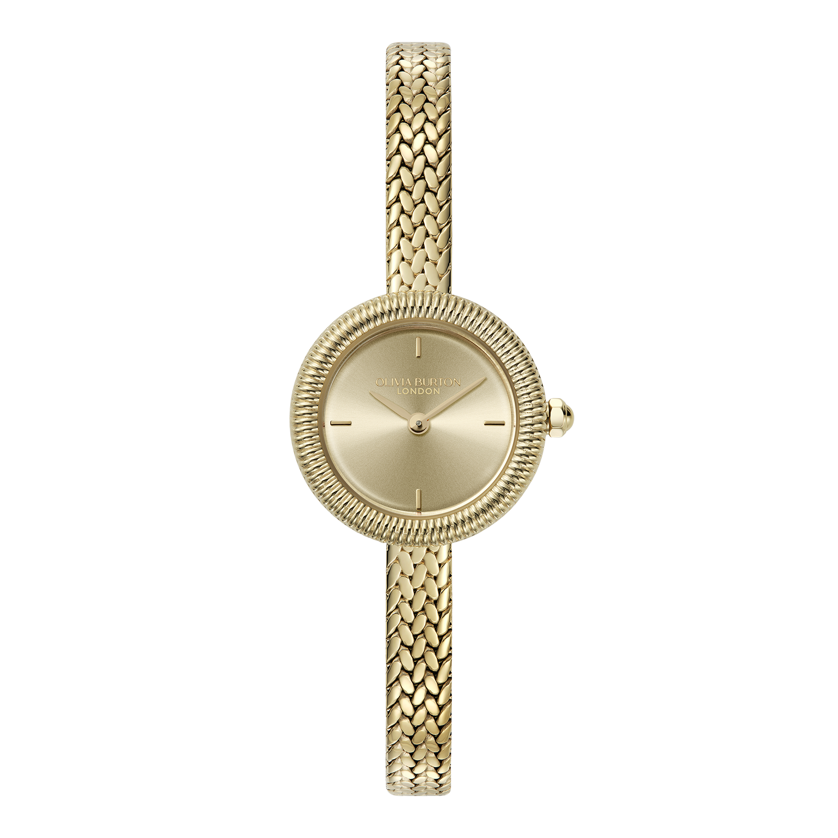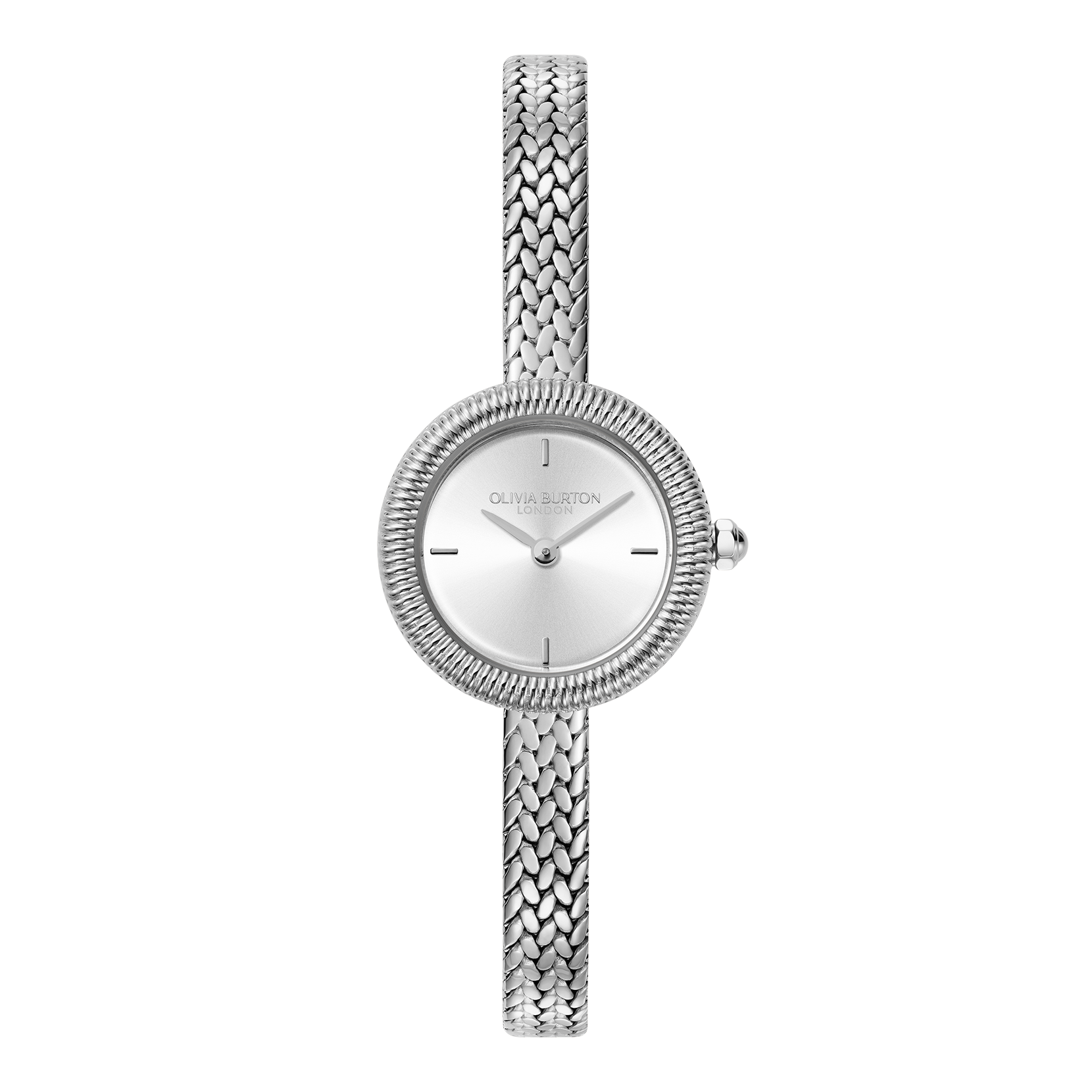 ブランドのアーカイブにあるヴィンテージデザイン、そしてオリビア・バートンのシグネチャーであるグログランリボンからインスピレーションを得た特別なシリーズです。20mmの小ぶりなケースには、繊細な“ツイスト”ディテールを施したテクスチャードベゼルを採用。ダイアルにはトーナルカラーのサンレイ加工を施し、シルバー、ゴールド、ローズゴールドの3種類をご用意。控えめなインデックスと組み合わせ、洗練された手元を演出します。ヴィンテージ感漂うメッシュストラップと組み合わせることで、クラシックとコンテンポラリーが美しく融合したミニウォッチが完成しました。