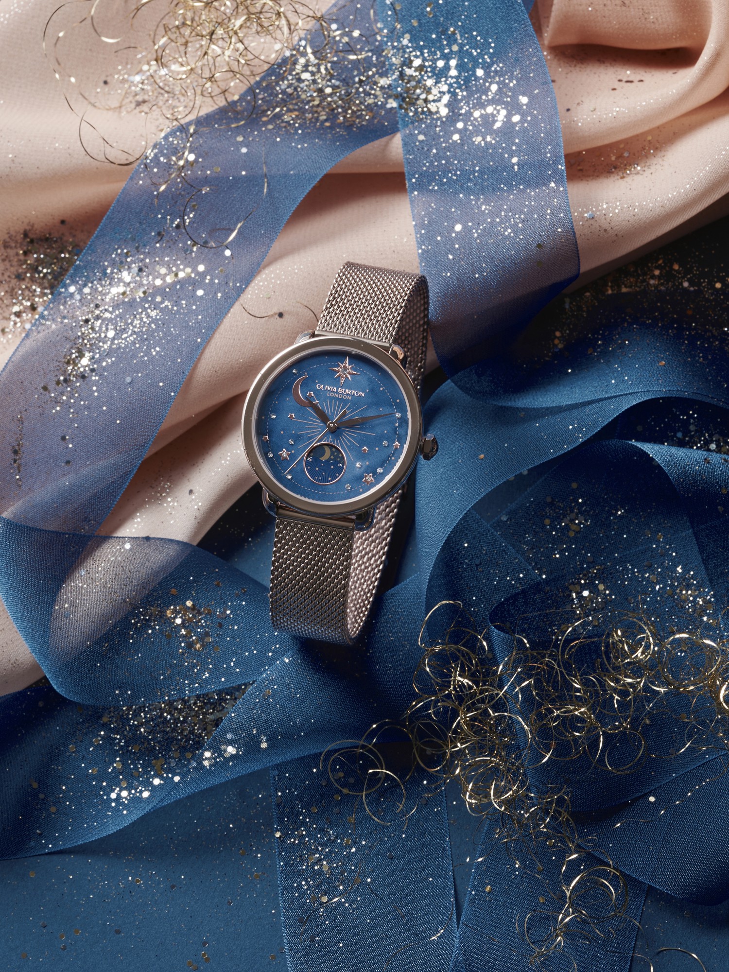 夜空の美しさと月の満ち欠けにインスパイアされた、幻想的でロマンティックな新作。占星術のチャートから着想を得たデザインに、星々のきらめきを散りばめ、宇宙の神秘を手元に表現します。文字盤には北極星を示すマーカーと繊細なムーンモチーフ、さらに小さなクリスタルのスターバーストをあしらい、まるで夜空を切り取ったかのような仕上がりに。ムーンフェイズ窓にはスターバーストのテクスチャーと繊細な星の装飾を施し、他にはないユニークな特徴となっています。神秘と魅惑に満ちた「Moonphase」は、宇宙や星々を愛するすべての人に捧げる、特別なコレクションです。