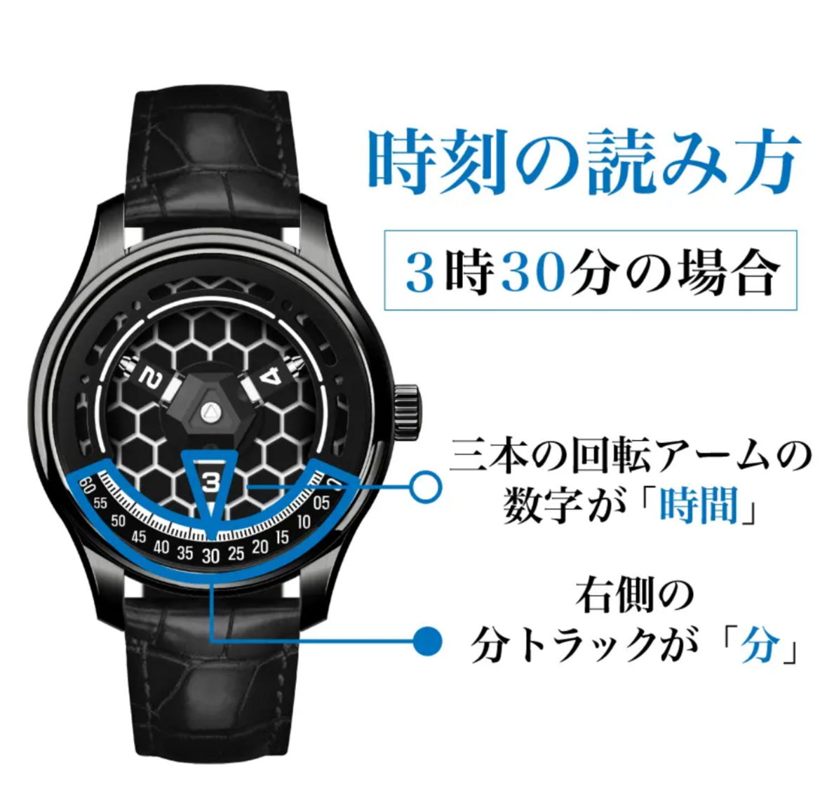 本製品は、蜂の巣構造から着想を得た六角形ハニカムダイヤルと、三本の回転アームによって時刻を表示する“ワンダリングアワー”機構を採用。