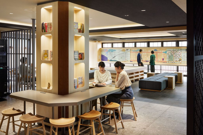 OMOベースは、フロント、ライブラリーを備えたパブリックスペースです。客室の延長として使える居心地の良さはもちろん、街歩きを楽しくする仕掛け満載の遊び心溢れた空間です。OMO3京都東寺では、京都の他の観光地に出かけた後でも、東寺エリアが一番の記憶に残っていてほしいという思いをこめてデザインされています。