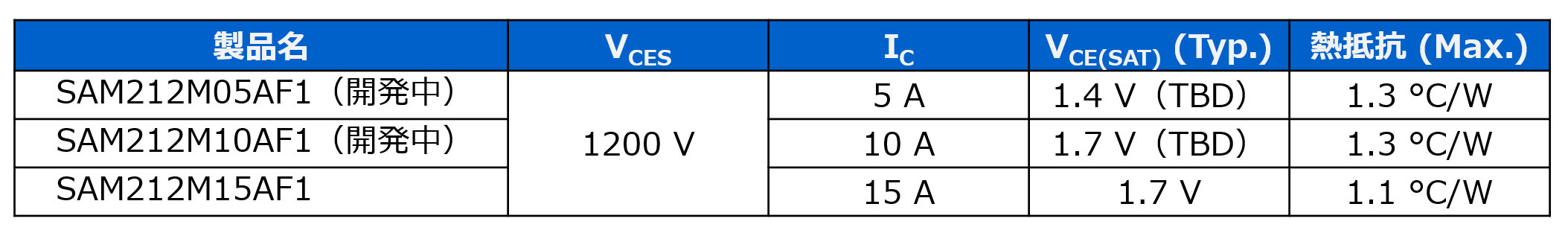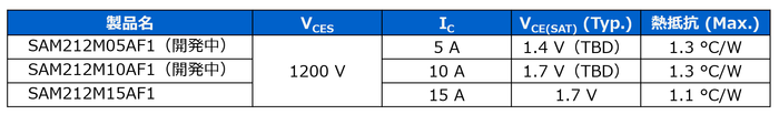 今回量産したSAM212M15AF1(15 A)に加え、電流定格違いのSAM212M10AF1(10 A)とSAM212M05AF1(5 A)を開発中です。