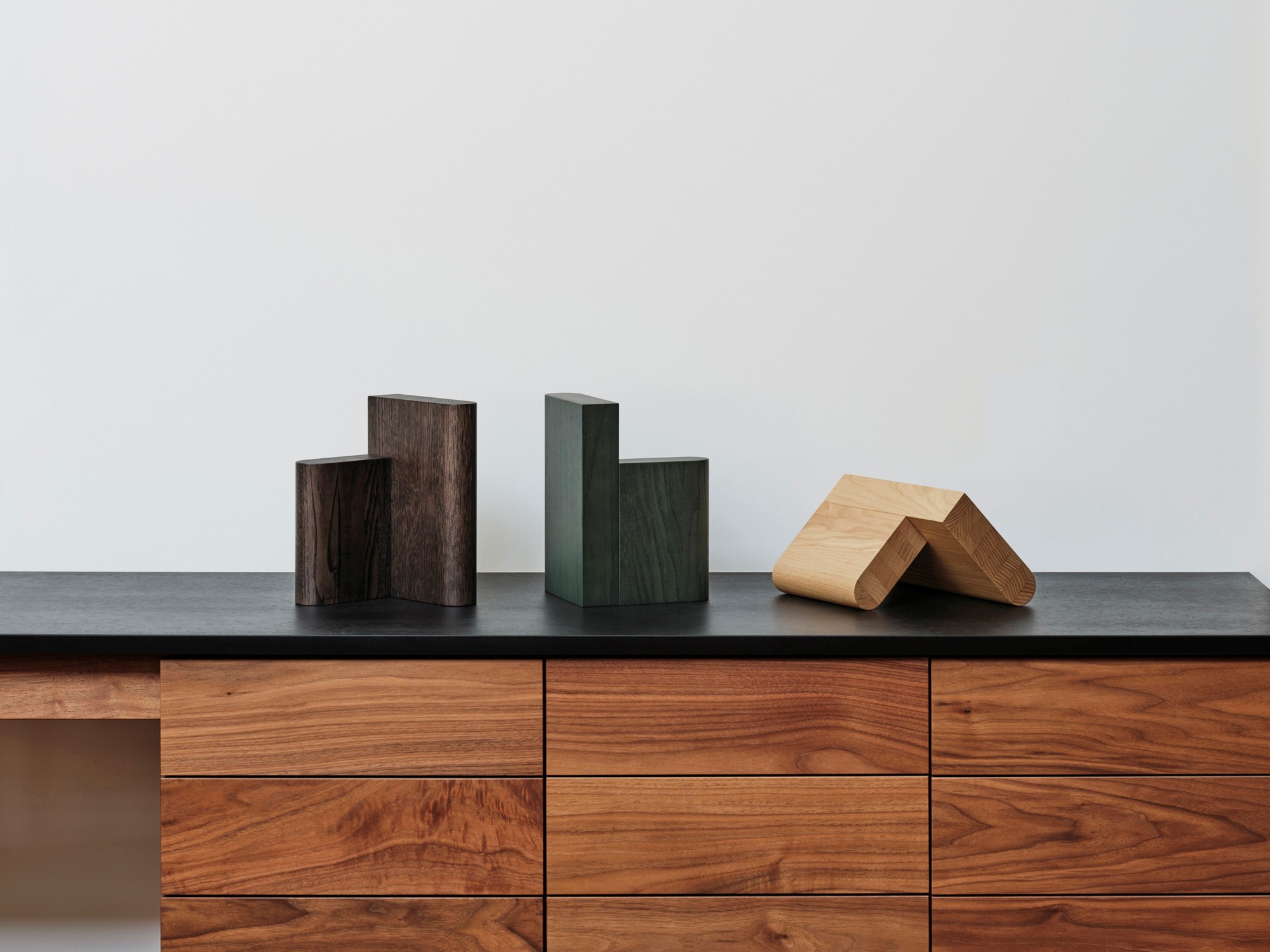 本体の切り欠き部分は、自然に手をかけやすいよう設計されており、使いやすさと美しさを両立。厚みのある木の塊は、単体でもオブジェとしての存在感を放ち、キャビネットや書棚、デスクなど多様な空間に調和します。
