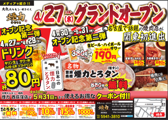 株式会社VISION MEAT WORKS(所在地:静岡県静岡市、代表取締役:青野 博志)は、2023年4月27日に大衆ホルモン・やきにく煙力(けむりき) 西荻窪FC店をオープンいたします。また近日中に豪徳寺・三鷹・神田・下高井戸・飯田橋とオープンを計画しております。煙力は名古屋から全国への展開が進む焼肉店であり、昨今の大衆焼肉ブームの先駆けとなった業態です。2023年6月末までに店舗数約30店舗となる予定です。