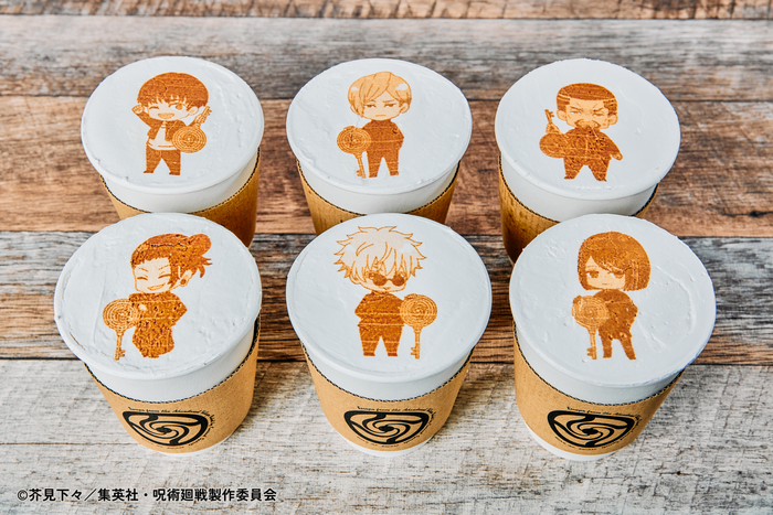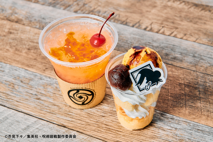 そんな本イベントの開催を記念して、東京会場でイベントコラボメニューの販売が決定いたしました!「五条悟の『蒼』『赫』『茈』パフェセット」は、五条の「術式順転『蒼』」、「術式反転『赫』」、「虚式『茈』」を、紫芋アイスなど五条の好物である甘味で表現したメニュー。ブルーゼリーを使用したスペシャルドリンクと合わせてお楽しみください! また、「夏油傑の呪霊玉風スイーツセット」は、夏油が呪霊を取り込むシーンの呪霊玉を、あんこで表現したスイーツ。オレンジゼリーを使用したスペシャルドリンクと相性抜群です。どちらも、五条や夏油ならではのメニューとなっており「呪術廻戦」ファンには特におすすめです。さらに、可愛い描き起こしSDイラストを使用した「キャラクターデザインラテアート」も販売! 全6種から選ぶことができるので、ぜひお気に入りのキャラクターのドリンクをお楽しみください。