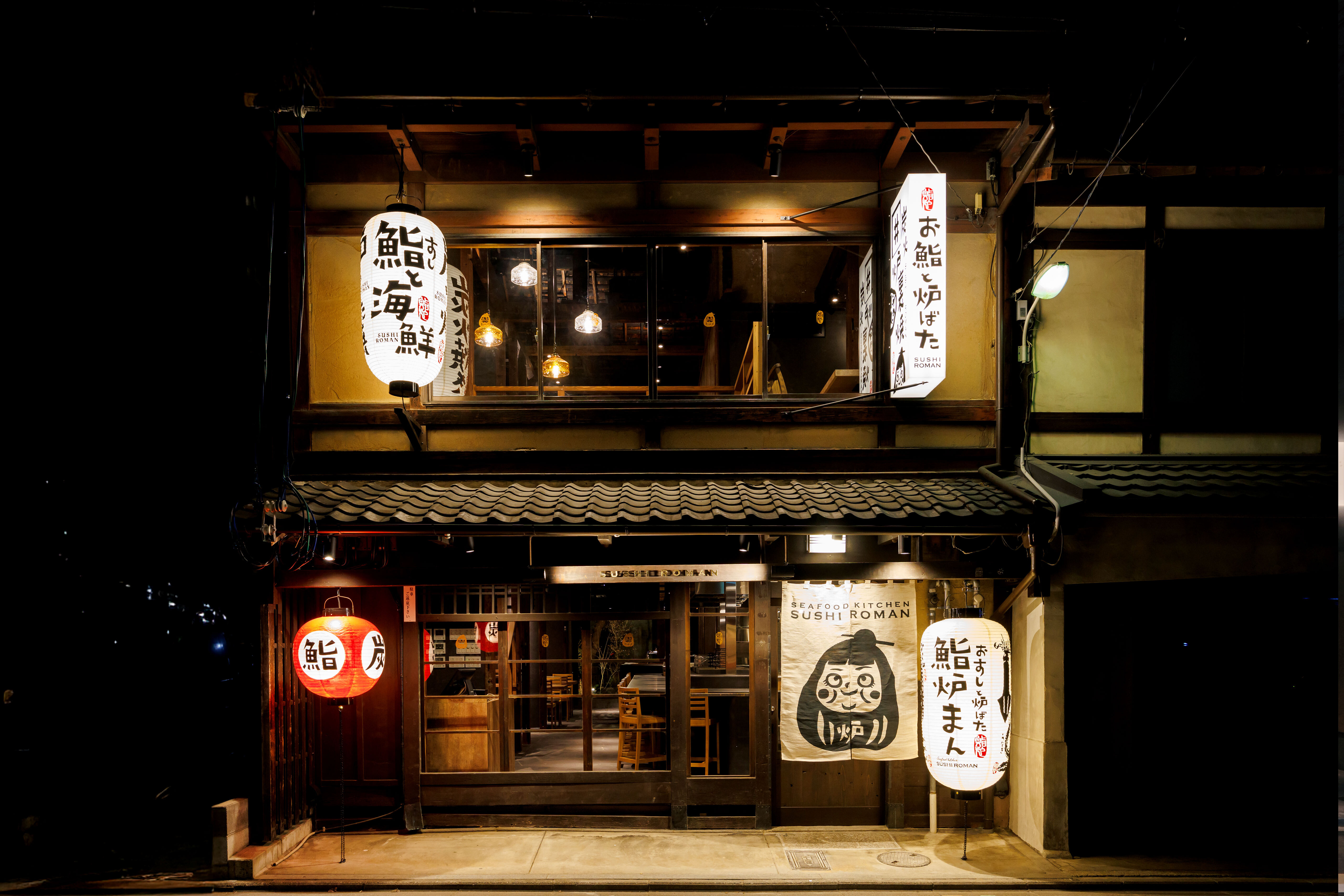2023年5月オープンの『錦上ル 炭炉まん』は、築90年を超える京町家を大改装したレトロな空間がSNSでジブリ映画のようだと評判を呼び、インバウンドや日本人観光客で連日にぎわう居酒屋です。ライブ感あふれる「お肉の炉端焼き」などの名物料理をはじめ彩り豊かなメニューを非日常空間の中で味わうことができ、随所にデザインされただるまのキャラクター「貫八(かんぱち)」が独特の雰囲気を創り出しています。