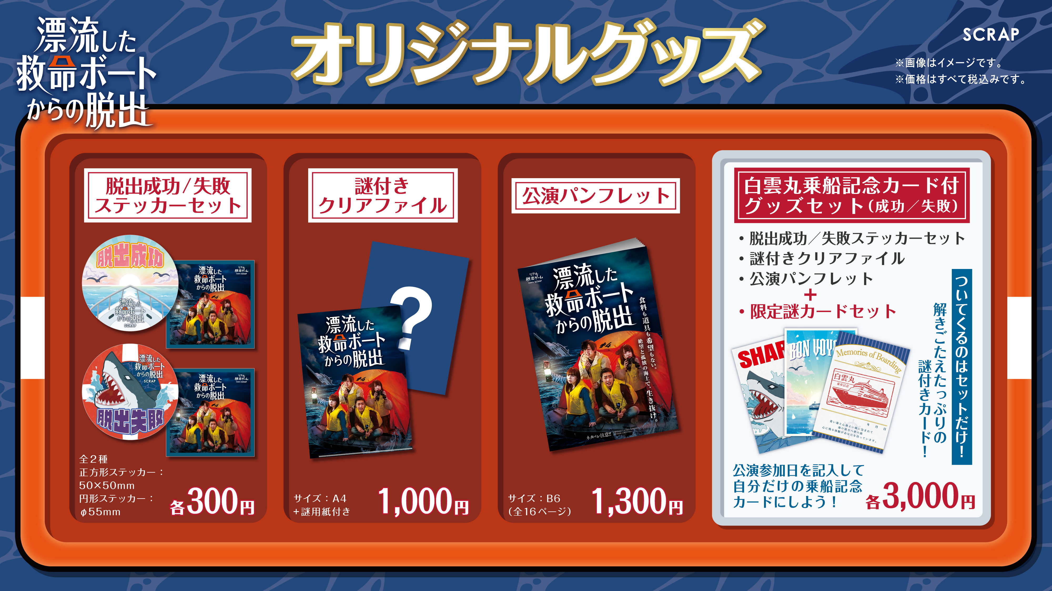 本日初公開となるのが、本イベント限定のオリジナルグッズです。リアル脱出ゲームのオリジナルグッズに欠かせない「脱出成功/失敗ステッカー」やマリン風のデザインがかわいい「謎付きクリアファイル」、そして『漂流した救命ボートからの脱出』の制作の裏側やディレクターインタビュー、公演の見どころがぎゅぎゅっと詰まったボリュームたっぷりの「公演パンフレット」ももちろんご用意しています。