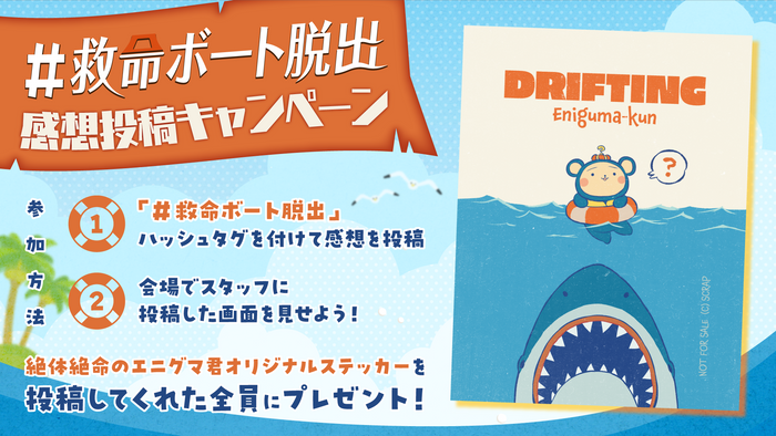 『漂流した救命ボートからの脱出』は、東京ミステリーサーカス4Fにて2024年4月25日(木)より公演スタート。イベントに参加後、「#救命ボート脱出」のハッシュタグをつけて感想を投稿すると、あの有名なサメ映画をオマージュしたオリジナルステッカーをプレゼントいたします。ぷかぷか海を漂流するSCRAPのオリジナルキャラクター「エニグマくん」のとぼけた表情と、しっかり獲物をロックオンしているサメのギャップが、なんともいえない気持ちになるデザインです。