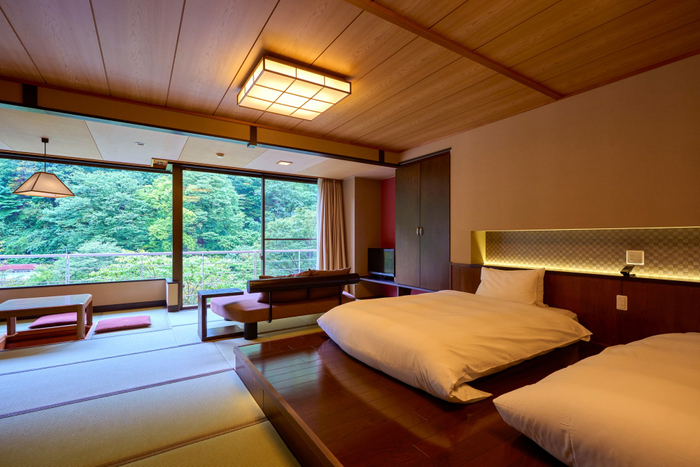 モダンなインテリアに掘りごたつ、自然の景色を楽しめるお部屋など、豊富な客室タイプをご用意しております。和のくつろぎと洋の快適さを併せ持つ和モダンルームや露天風呂付き客室など、お好みや用途に合わせてお選びいただけます。