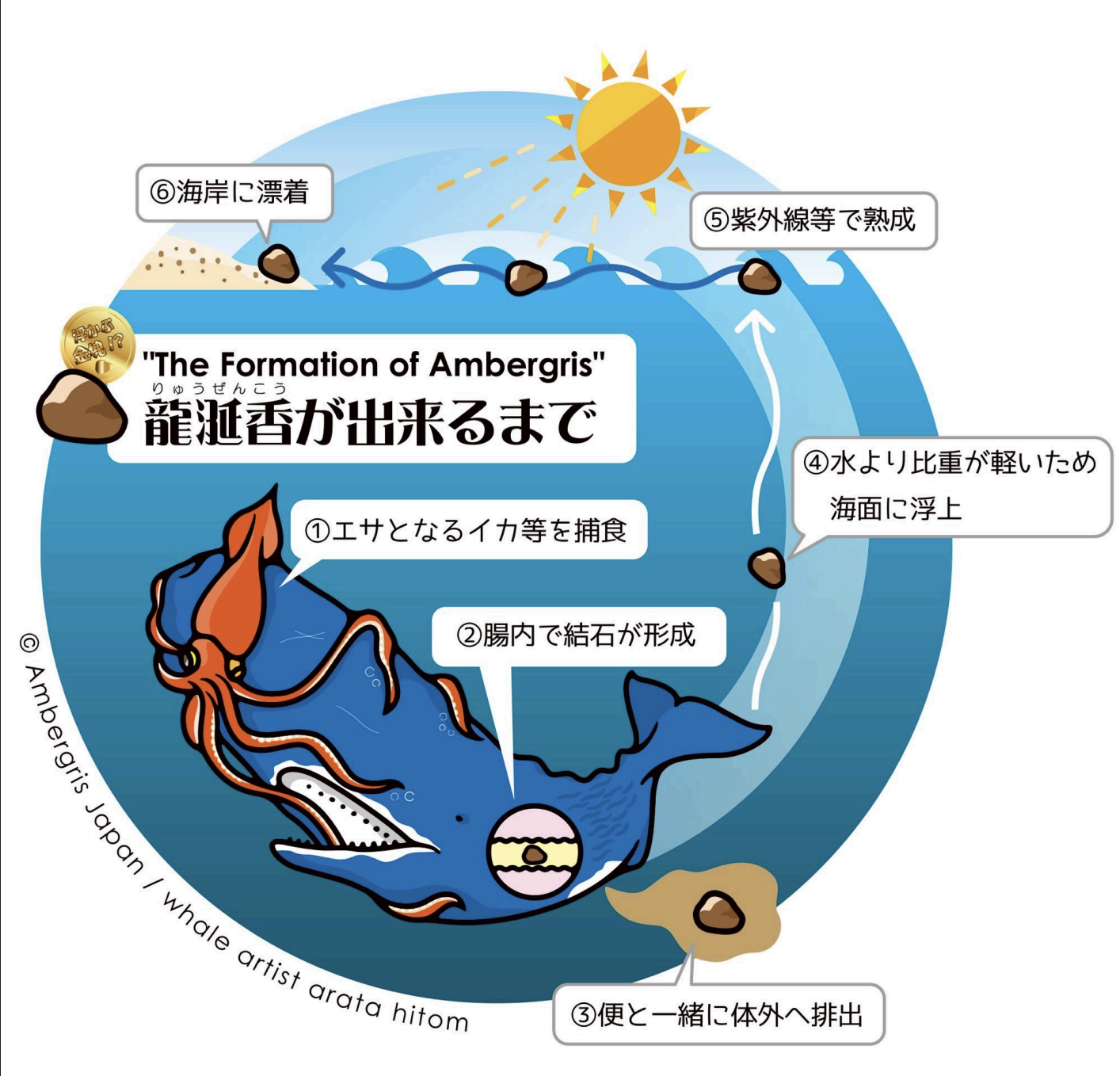 「龍涎香」は、マッコウクジラの体内で形成される結石で、排出された後に長い年月をかけて熟成され、最終的に海岸に漂着します。その香りは世界中で高く評価され、古来より香料として珍重されてきました。