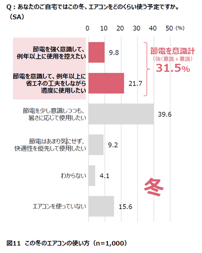 実際に、この夏と冬のエアコンの使い方について聞いてみると、「冬のほうが夏よりも節電を意識して使用したい」という傾向が強く出る結果になりました(図10、11)。一般的に、エアコンは夏の冷房運転よりも冬の暖房運転時のほうが、消費電力が大きくなります。電気代の値上がりが続く中、冬の節電で十分な成果を出すためにはエアコンの節電が重要であり、この回答結果は良い傾向といえます。無理のない範囲で節電をするために、エアコンの上手な使い方も知っていただきながら、この冬を賢く乗り切っていただければと思います。