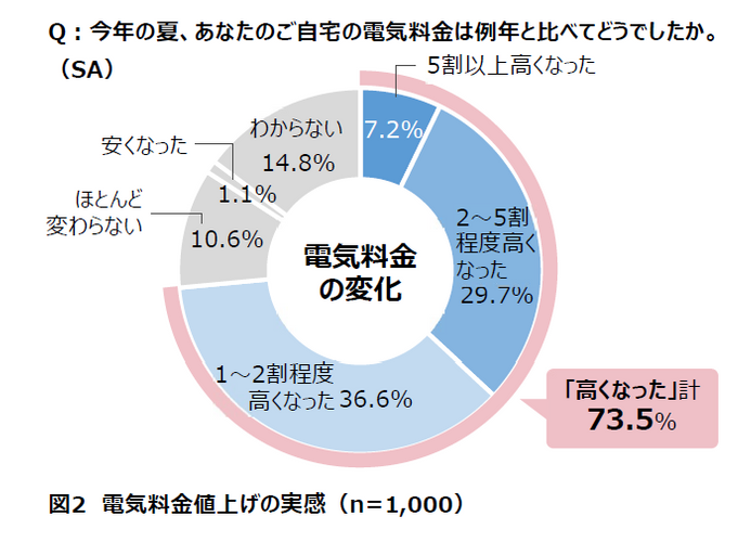 値上げラッシュで気になる「電気代」、7割超(73.5%)が値上がりを実感