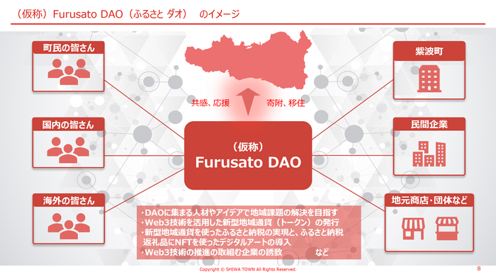ふるさと納税の返礼品として、NFT を提供する企画が検討されており、ふるさと納税の寄付金の使い道を DAO 内で決めていくというアイデアも出ています。