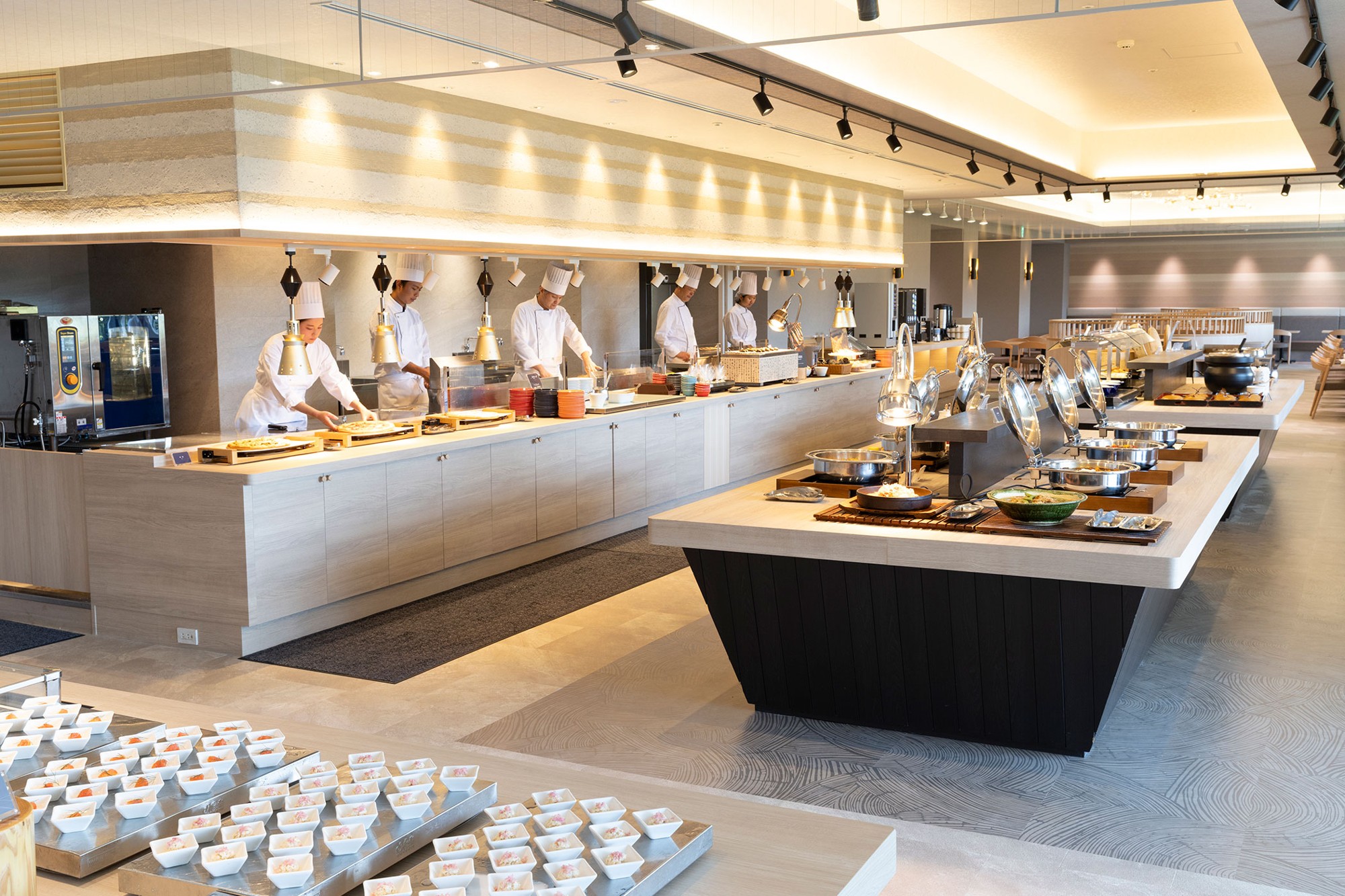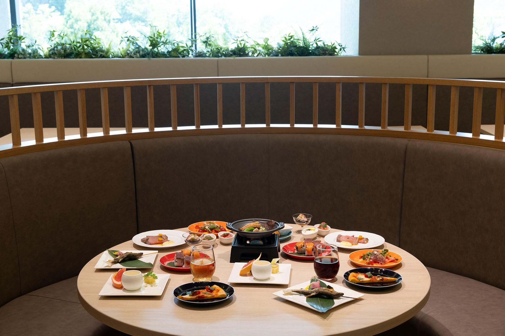「ゆったりと、たおやかに。」お食事を楽しんでいただけるよう、各テーブルの間隔にゆとりを持たせ、今まで以上にゆったりと食事をお楽しみいただけるようにリニューアル。壁や床のトーン、また照明もシックでモダンな印象のものに変更し、ゆっくり食事を味わっていただける空間に生まれ変わりました。また「オールインクルーシブ」を採用しているので、夕食時のアルコールはすべて飲み放題。岐阜県のお酒もご用意しております。