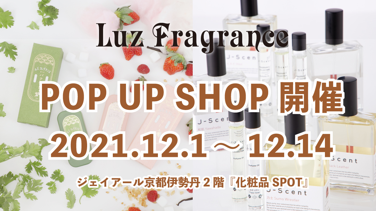 2021年12月1日(水)~12月14日(火)ジェイアール京都伊勢丹にてLuz FragranceのPOP UP SHOPを開催します。新商品オードパクチー、オードベリーに加え、J-Scentのオードパルファン及びパフュームオイル各20種も販売。是非この機会にLuz Fragranceの香り製品をお試しください。
