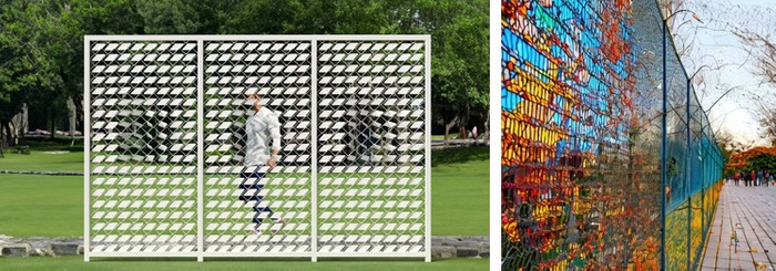 コロナ禍をきっかけの一つとして、人と人のコミュニケーションの在り方が大きく変化する中、3者は人同士のほどよい距離や気配、それを保つ空間について、産学連携で共同研究を行ってきました。DNPは、新しいコミュニケーション空間の提案として、2021年に「気配のつくりかた」展*2 を開催しました。見る角度で透過率が変わる特殊なファブリック(布・生地)を活用することで、人の気配を感じながら、"緩やかに人と人がつながる空間づくり"を提案しました。また共和鋼業と近畿大学は、2021年に工業資材であるネットフェンスにカラフルなチューブを取り付けて絵や文字をデザインする「グラフィックフェンス」を共同開発しました。空き地・工事現場・道路・公園・学校・テニスコートなどの敷地や空間を仕切ると同時に、フェンス自体が情報発信のインターフェースとして、新たなコミュニケーション空間、都市景観を生み出していくという独創的なアイデアです。DNPが開催した「気配のつくりかた」展での出会いをきっかけに3者が連携し、インターフェンスプロジェクトが始動しました。3者は、空間を「仕切ることでつながる」を共通のテーマに、新たなコミュニケーション空間を生み出すとともに、つながりや街づくりについて検討していきます。