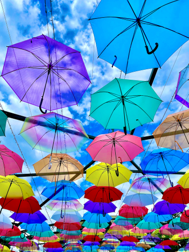 頭上に浮かぶ傘のアーケードと、傘を透過して地面をカラフルに彩る影が、暑い夏に涼しげな空間を作ります。