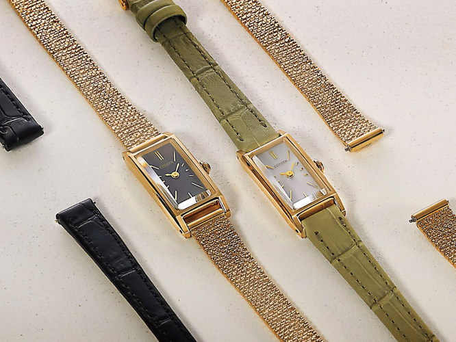 文字盤はココシュニックのオリジナルデザインで、時計ケースの裏蓋には「CITIZEN Kii×COCOSHNIK」のロゴが入り、スペシャルな仕様に。ジュエリー感覚の華奢なベルトは金属とカーフレザーの2種類を付属し、気分によって付け替えを楽しめます。