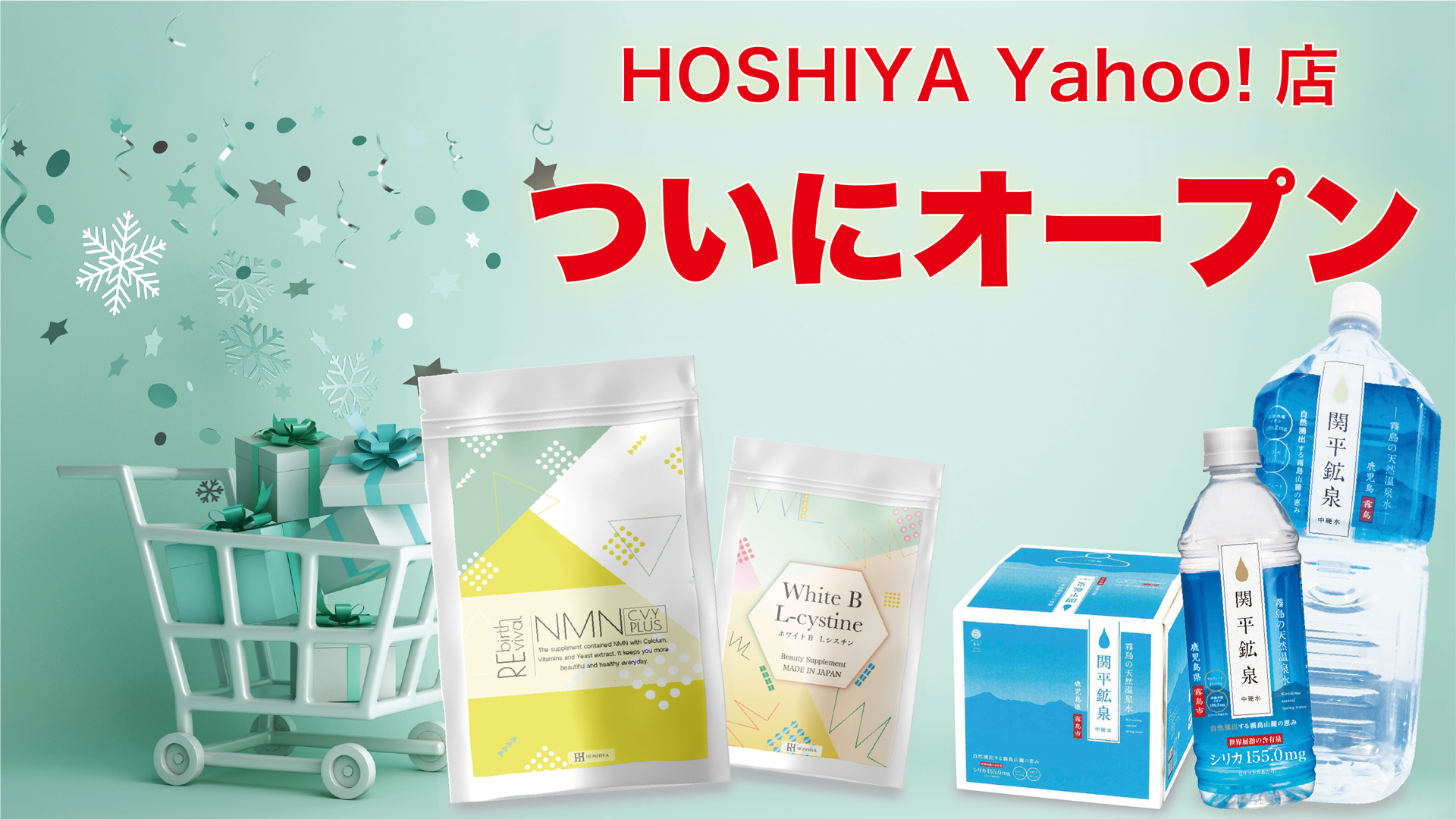 HOSHIYAでは、鹿児島県霧島の温泉シリカ水「関平鉱泉水」をはじめ、L-シスチンやNMNの美容系サプリメントの販売を展開中。