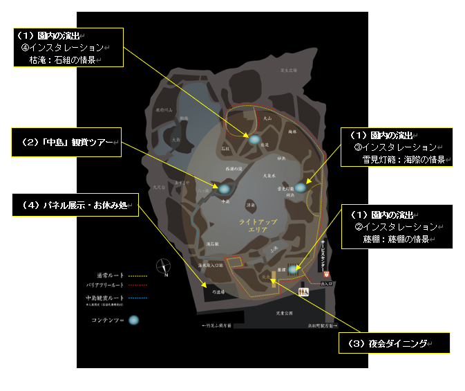 内容:ライトアップされた庭園の中島をスタッフの案内で回遊します。幻想的な中島を間近でご覧ください。