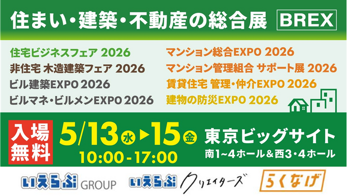 5/13(水)~15(金)の「住まい・建築・不動産の総合展【BREX】賃貸住宅 管理・仲介EXPO 2026/不動産売買ゾーン」にいえらぶGROUP、いえらぶクリエイターズ、らくなげが出展!