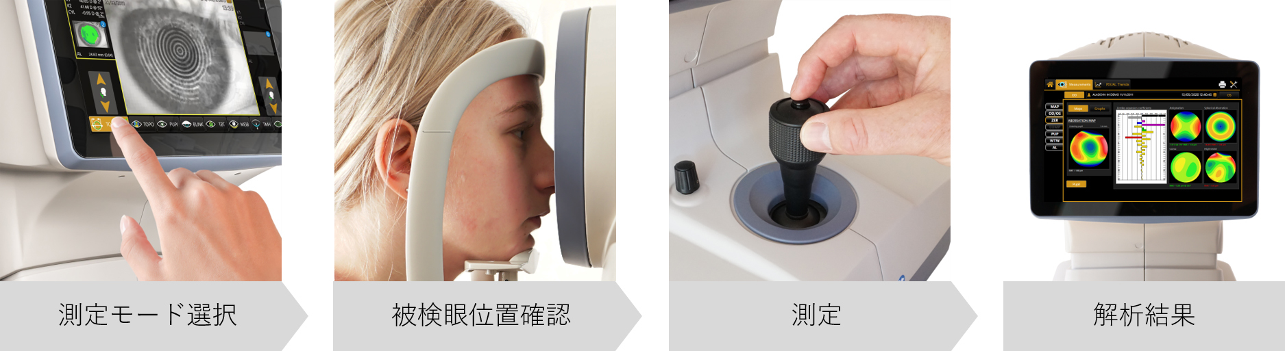 コントロールレバーの操作と、撮影ボタンを押すだけで眼軸長と角膜トポブラフィーを一度に測定できます。その他の測定モードも画面のインジケータに従って簡単に操作でき、測定後には本体画面上で解析結果が確認できます。