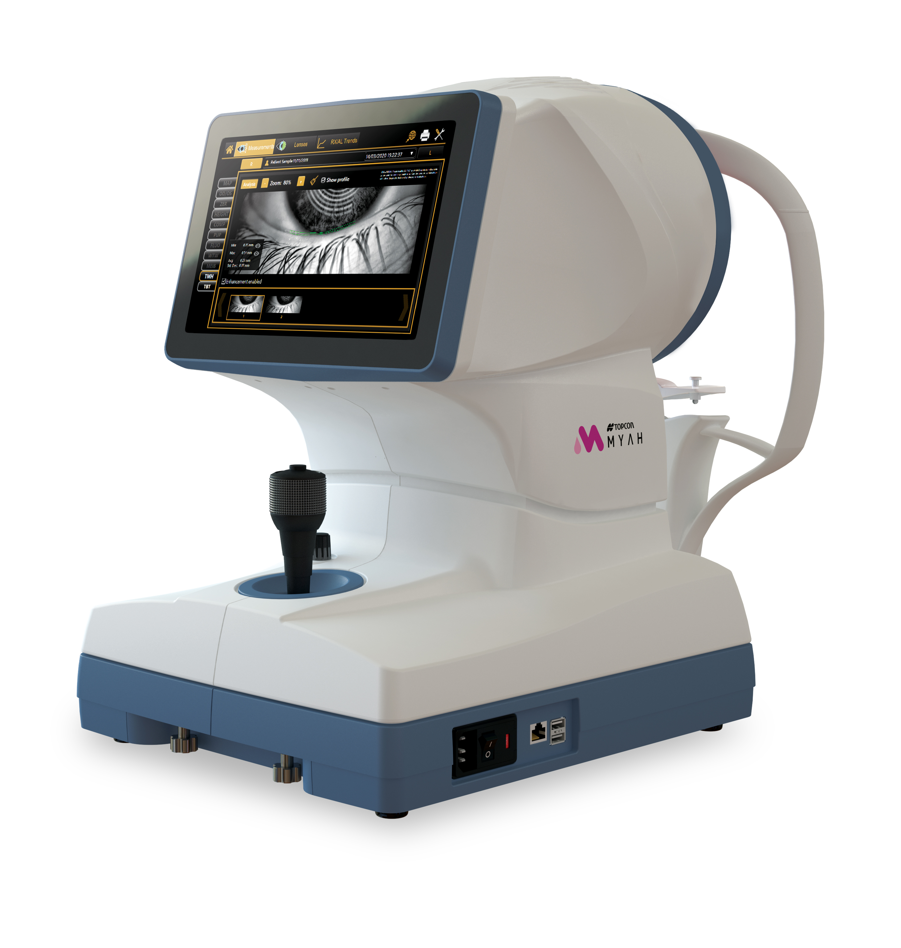 MYAHは、一度の測定で眼軸長測定*と角膜トポグラフィー*を同時に測定し、角膜曲率半径や角膜収差解析*など様々な情報やドライアイ診断の指標となる検査、また経過観測に有益なレポート機能を一台に集約し、省スペース化を実現したマルチファンクションな検査機器となります。