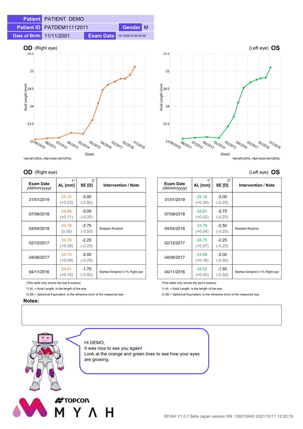 眼軸長や屈折値の経時変化や、経過観察に役立つレポート機能を搭載し、予防、診断、治療の検討や患者さんへの説明にご活用頂けます。