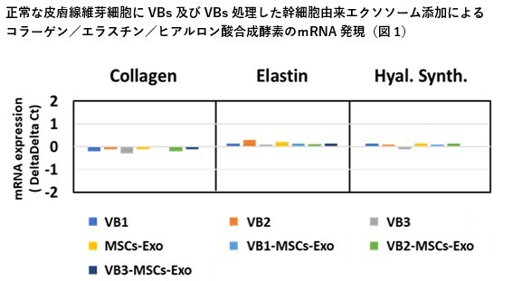 ストレスを受けていない正常な皮膚線維芽細胞にVBs(VB1,VB2,VB3)並びに幹細胞由来エクソソーム、VBs処理した幹細胞由来エクソソーム(VBs-MSCs-Exo)を添加し、皮膚の恒常性維持に寄与する重要な3つのパラメータ(コラーゲン/エラスチン/ヒアルロン酸合成酵素)の4時間後のmRNAレベルの変化を調べた。