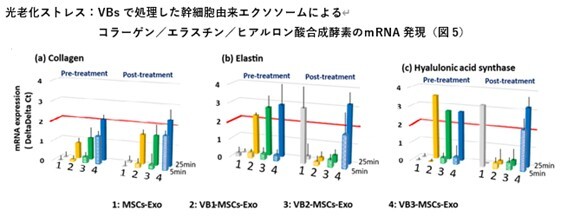 皮膚繊維芽細胞に紫外線ストレス(UV照射)を5分/25分曝露し、ストレスを与える前または後の4時間、幹細胞由来の通常のエクソソーム(MSCs-Exo)及び、VBsで処理した幹細胞由来エクソソーム(VBs-MSCs-Exo)を添加し、mRNAを抽出した。皮膚の恒常性維持に寄与する重要な3つのパラメータ(コラーゲン/エラスチン/ヒアルロン酸合成酵素)のmRNAレベルの変化を調べた。