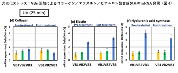 皮膚繊維芽細胞に紫外線ストレス(UV照射)を25分曝露し、ストレス付加の前または後の4時間、VB処理を施し、mRNAを抽出した。皮膚の恒常性維持に寄与する重要な3つのパラメータ(コラーゲン/エラスチン/ヒアルロン酸合成酵素)のmRNAレベルの変化を調べた。