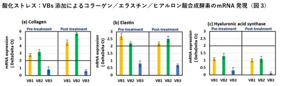 皮膚繊維芽細胞に酸化ストレス(H2O2)を2時間曝露し、ストレス付加の前または後の4時間、VB処理を施し、mRNAを抽出した。皮膚の恒常性維持に寄与する重要な3つのパラメータ(コラーゲン/エラスチン/ヒアルロン酸合成酵素)のmRNAレベルの変化を調べた。