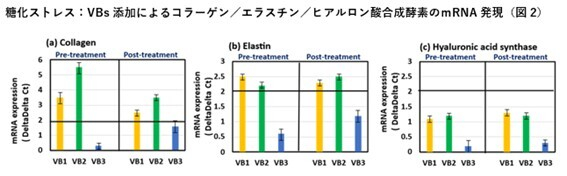 皮膚繊維芽細胞に糖化ストレス(AGE)を2時間曝露し、ストレス付加の前または後の4時間、VB処理を施し、mRNAを抽出した。皮膚の恒常性維持に寄与する重要な3つのパラメータ(コラーゲン/エラスチン/ヒアルロン酸合成酵素)のmRNAレベルの変化を調べた。