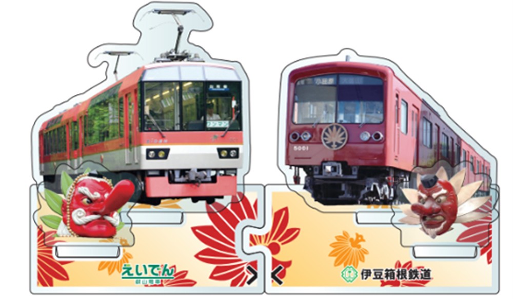<仕様>各社の天狗モニュメントと電車(伊豆箱根鉄道:天狗電車、叡山電鉄:きらら)をデザインしたアクリルスタンドです。台座が凹凸になっており、連結することができます。