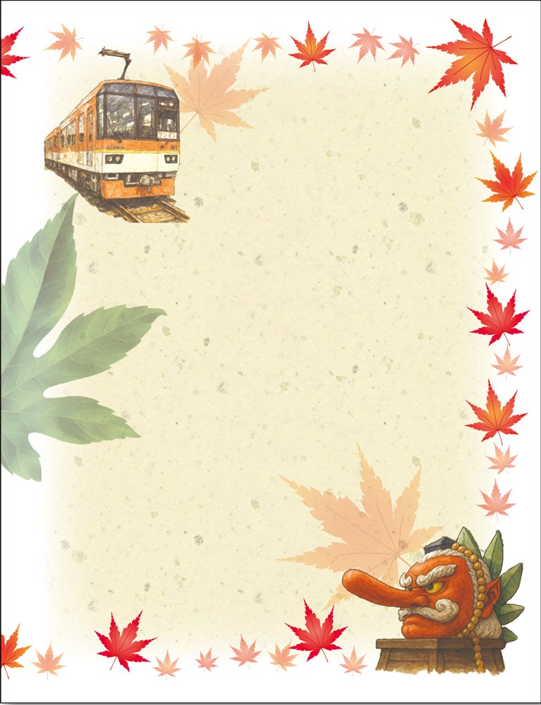 (4)仕様 記念台紙は各社の天狗モニュメントと電車、紅葉のイラストをデザインしています。各社・各寺院の台紙を並べると絵柄がつながります。 サイズ:W100㎜×H130㎜