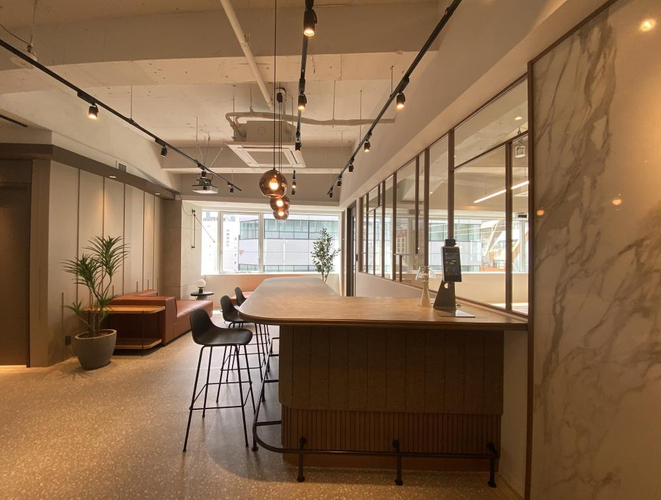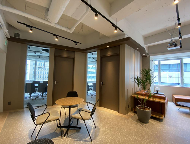 フリースペースや執務室、集中ブースなどあらゆる作業場所があるので社内コミュニケーションが生まれやすい空間です!こういったホテルライクなデザイン性の高い内装は社員満足度も高まりますので、お早めにお問い合わせしてください。