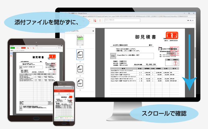 申請フォーム上にPDFが貼り付けられるので、承認者の確認時にもわざわざ添付ファイルをダウンロードして別画面でPDFを開く操作が不要です。