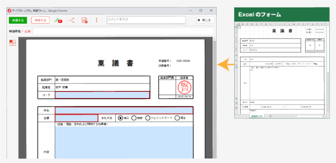 慣れた申請書と見た目が同じのため使い方がわかりやすく、現在の運用を変えずにペーパーレス化を実現します。