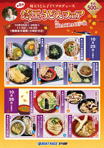 また、第4回漫画アクションカップ開催中の10月25日(土)と26日(日)の2日間は、BOAT RACE戸田ではすでに恒例行事となった人気イベント『第8回埼玉うどんフェア』も実施される。