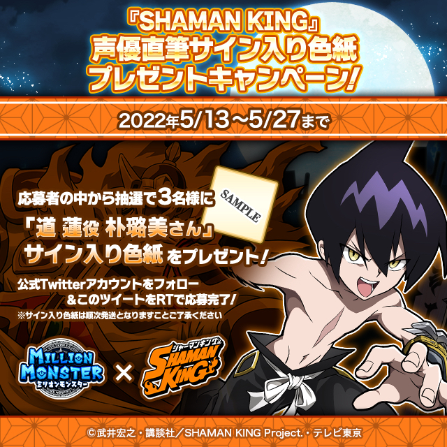 TVアニメ『SHAMAN KING』のコラボキャラクター「麻倉 葉」「ハオ」「道 蓮(※)」「アイアンメイデン・ジャンヌ」「恐山 アンナ」の各声優「直筆サイン色紙」が抽選で各3名様(合計15名様)に当たるプレゼントキャンペーンを開催いたします。