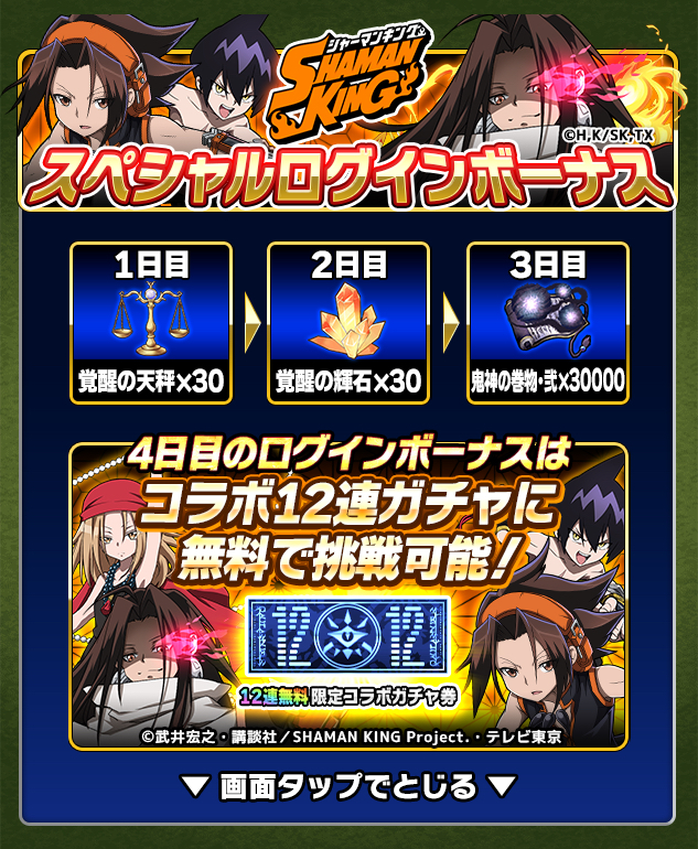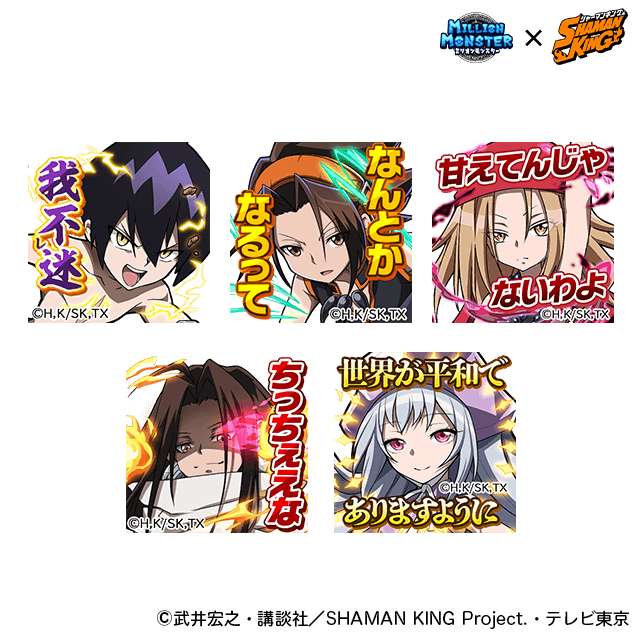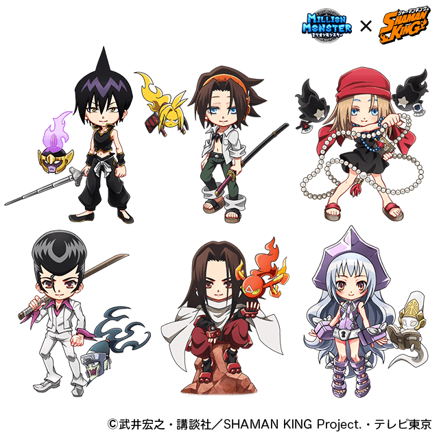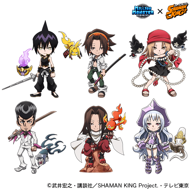 TVアニメ『SHAMAN KING』の人気キャラ「麻倉 葉」「ハオ」「道 蓮(※)」「アイアンメイデン・ジャンヌ」「恐山 アンナ」が獲得できるコラボ限定ガチャが登場します。